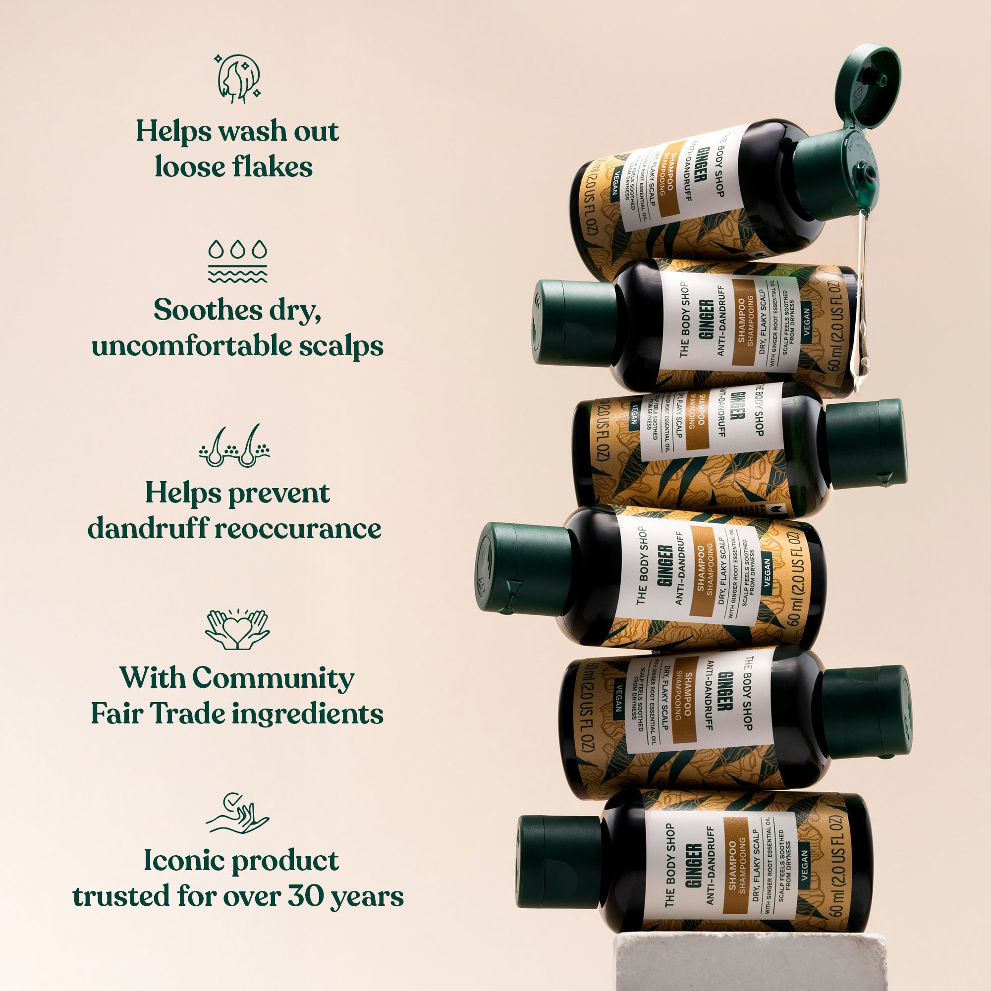 Sjampó hannað fyrir þurran hársvörð en hentar þó vel flestum gerðum hárs. Inniheldur Community Fair Trade engifer ilmkjarnaolíu og seyði unnið úr birki- og víðiberki sem saman stuðla að heilbrigðum hársverði sem er laus við þurrk og pirring. Hreinsar og róar hársvörðinn og stuðlar að auknu heilbrigði hans svo meiri rækt, þykkt og vöxtur komist í hárið. Bestur árangur næst ef notuð er þriggja þrepa aðferð, Ginger Anti-dandruff Shampoo, svo Ginger Scalp Care Conditioner og að síðustu Ginger Scalp Serum. Okkar vinsælasta sjampó, enda selst flaska á 9 sekúndna fresti, á heimsvísu. Umbúðirnar (fyrir utan tappann) eru úr 100% endurunnu plasti úr Community Fair Trade plastverkefni okkar á Indlandi, sem er svo endurvinnanlegt aftur.